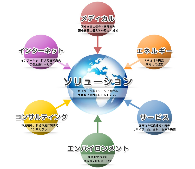 弊社は様々なビジネスシーン(メディカル・エネルギー・サービス・エンバイロンメント・コンサルティング・インターネット全般)における問題解決のお手伝いをする企業です。